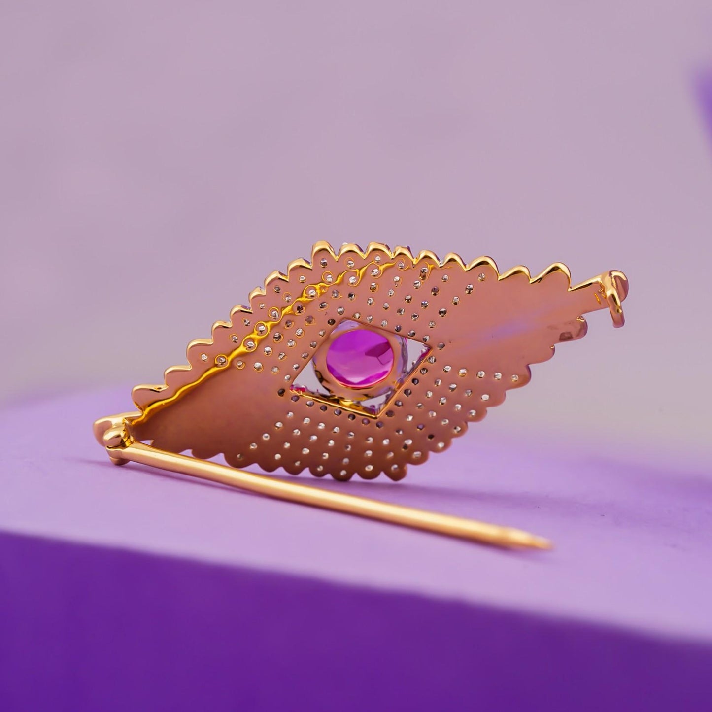 a masterpiece of passion and luxury. Crafted with radiant 14K gold plating, this brooch showcases mesmerizing red ruby stones, symbolizing love, strength, and timeless beauty.